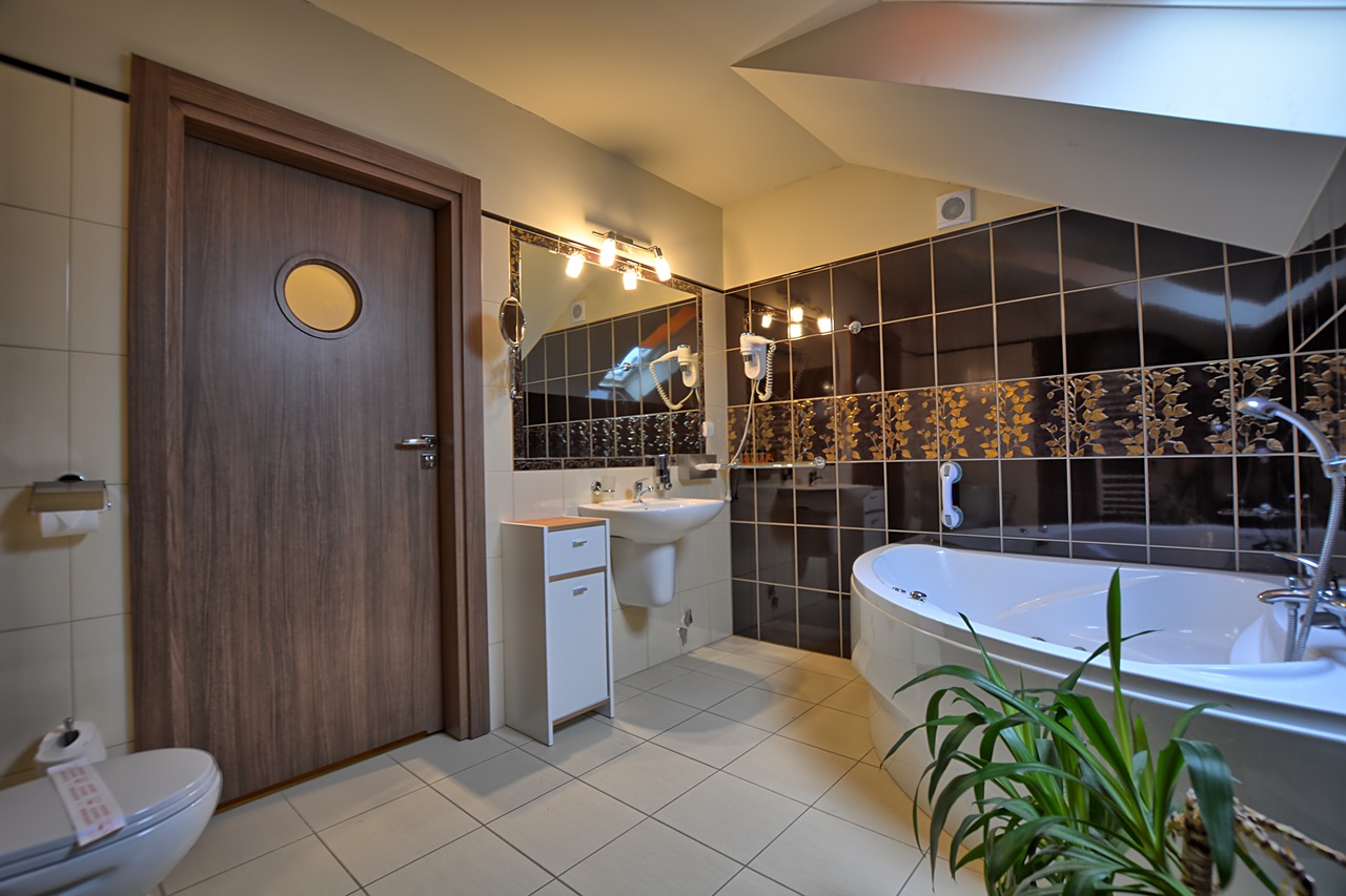 Dodatkowe wyposażanie to: aneks z lodówką i czajnikiem oraz dodatkowymi półkami, zestaw do parzenia kawy i herbaty, smart TV 49′, sejf, szafa, ława, fotele i krzesła. W Apartamencie znajduje się łazienka z narożną wanną z hydromasażem oraz klimatyzacja.